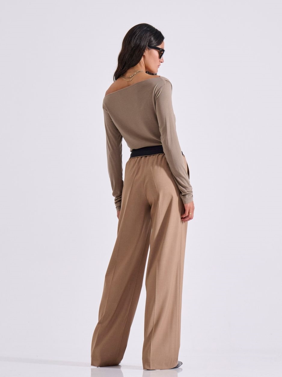 Relaxed-fit pants in camel color, crafted from a soft wool-blend fabric, designed to flatter all body types. Featuring subtle side seams and a black elastic waistband with “Libelloula” embroidery in black, for a subtle yet statement detail. It can be worn in two ways: with the waistband folded down to reveal the embroidery or up for a clean, minimal look. Perfect with heels, sandals or ankle boots for evening wear, or with sneakers, ballerinas and boots for all-day comfort and style. Pair it with knitwear, bodysuits, shirts or t-shirts and a blazer for a chic finish.