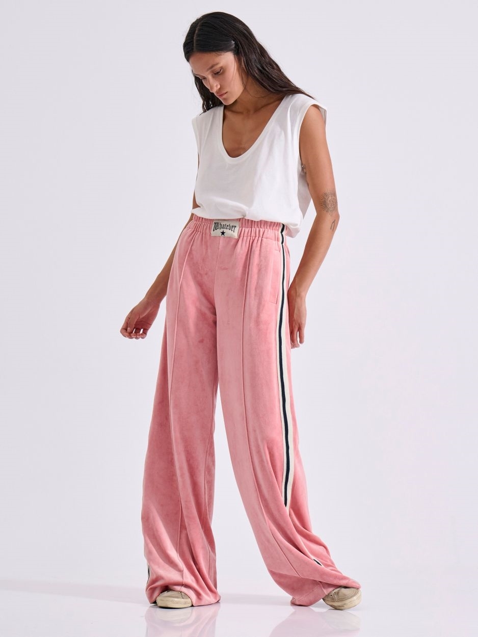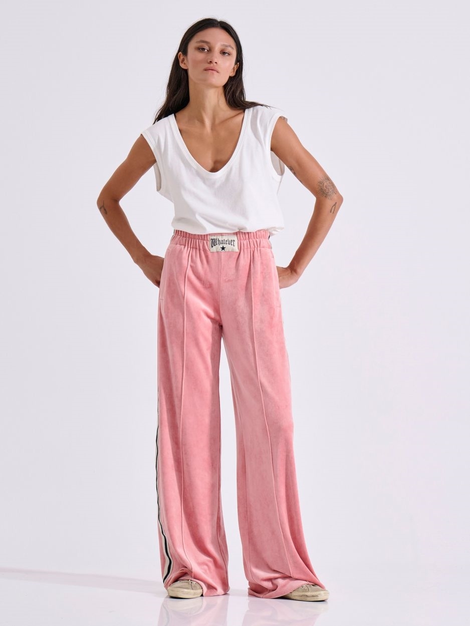 Velour sweatpants made from soft, stretchy velvet fabric that gently hugs the body, offering ease of movement and a smooth touch.