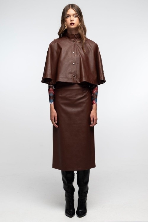 Our Liquorice Midi Skirt gives refined and lady-like. This mid-length pencil skirt has an invisible zip and slit at the center back for a sleek fit. Available in endlessly versatile black or classic autumnal brown eco-leather, wear a Romancer Mesh Top tucked in to show off the metallic Chaka detail at the hip. Code: W25312