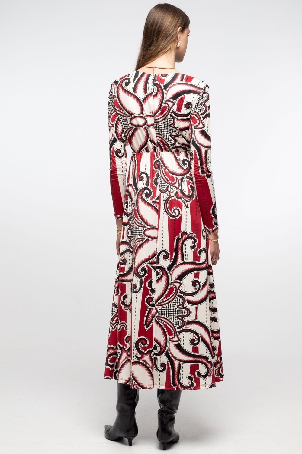 Our Alchemy Long Skirt features a sophisticated red, black and ecru placement print and the subtle shimmer of leopard satin jacquard. This A-line skirt sits high on the waist with a smooth waistband, invisible zip and elastic band at the center back for a sleek fit. Wear yours with a matching Alchemy Shirt or a Copper Top in black for refined yet free-spirited vibes.