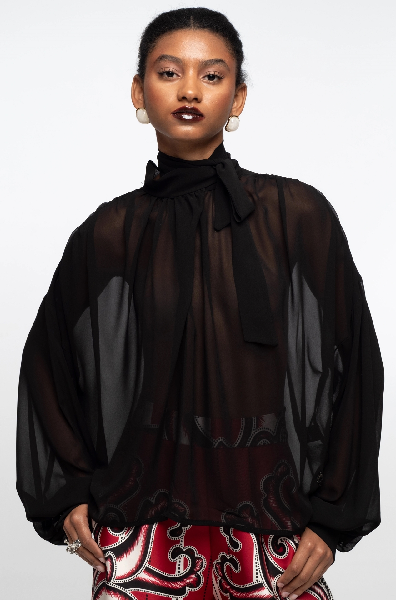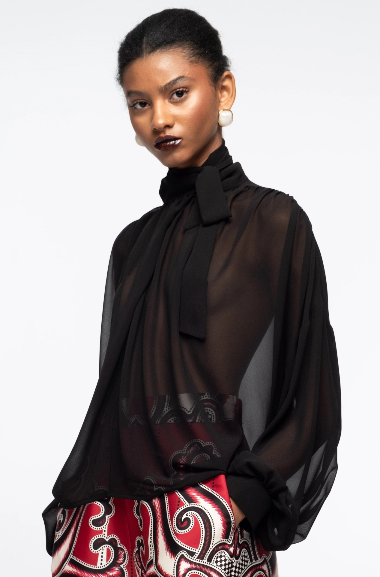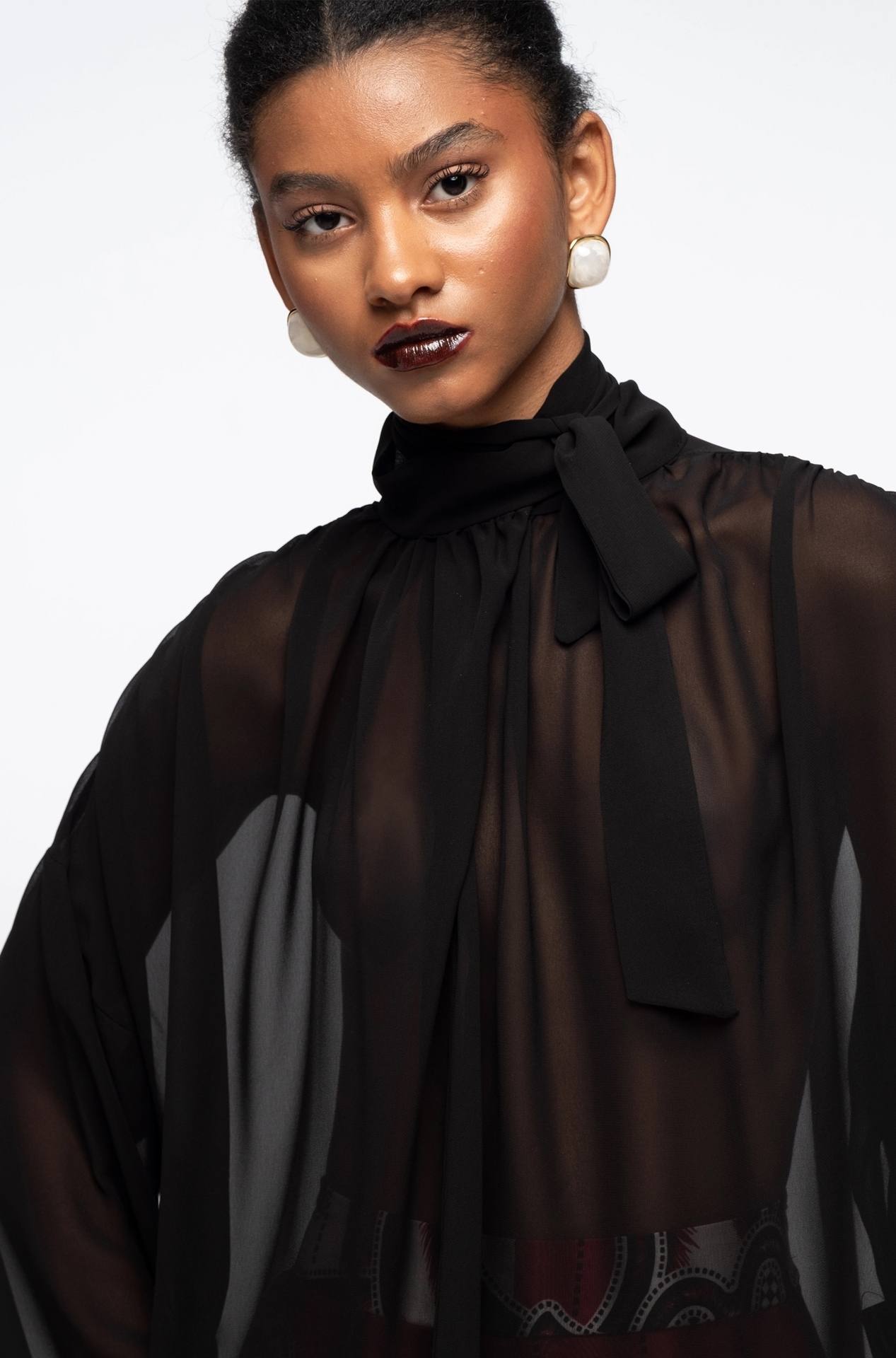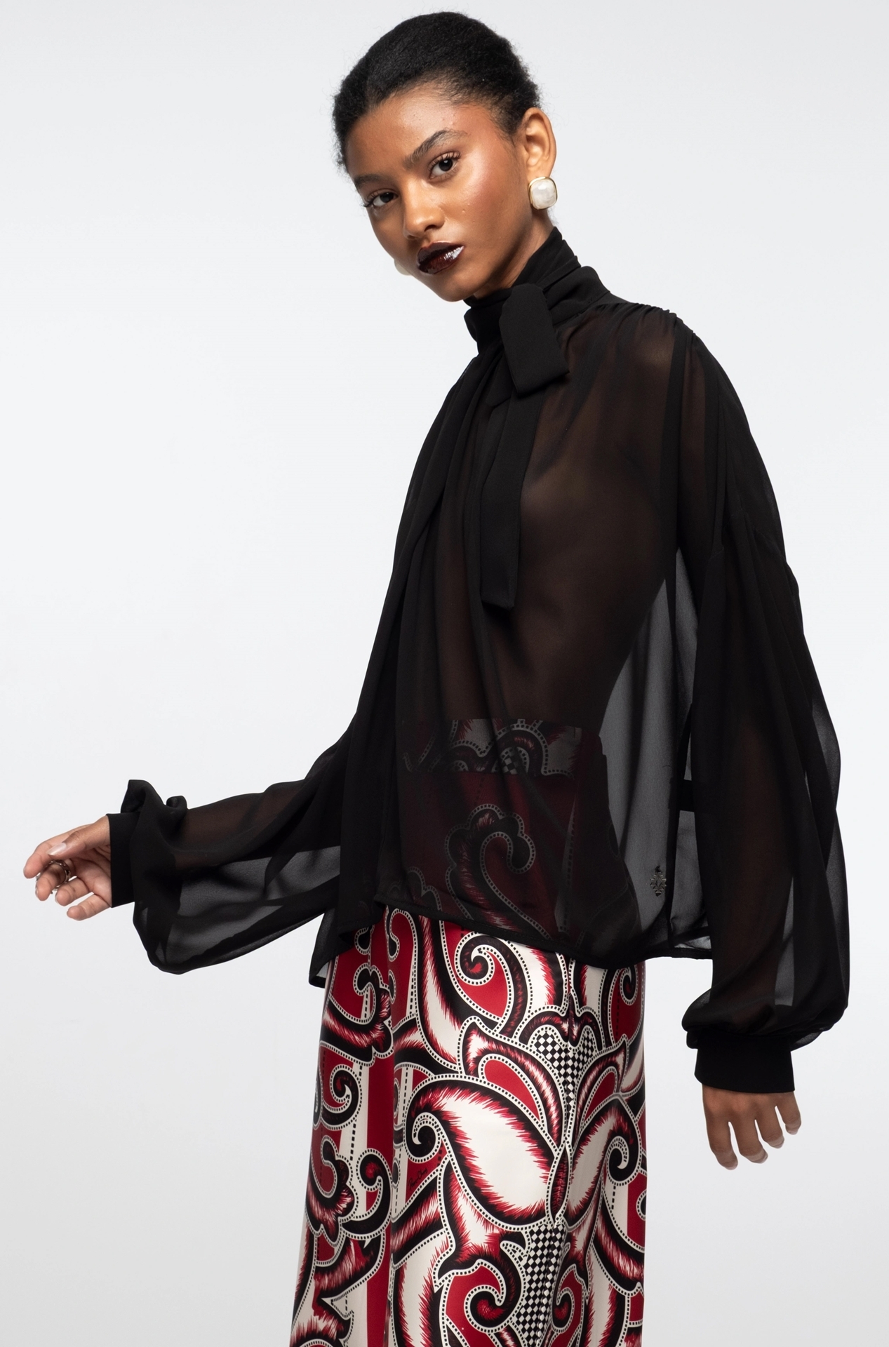 Botanical satin jacquard blousTie-neck chiffon sheer blouse